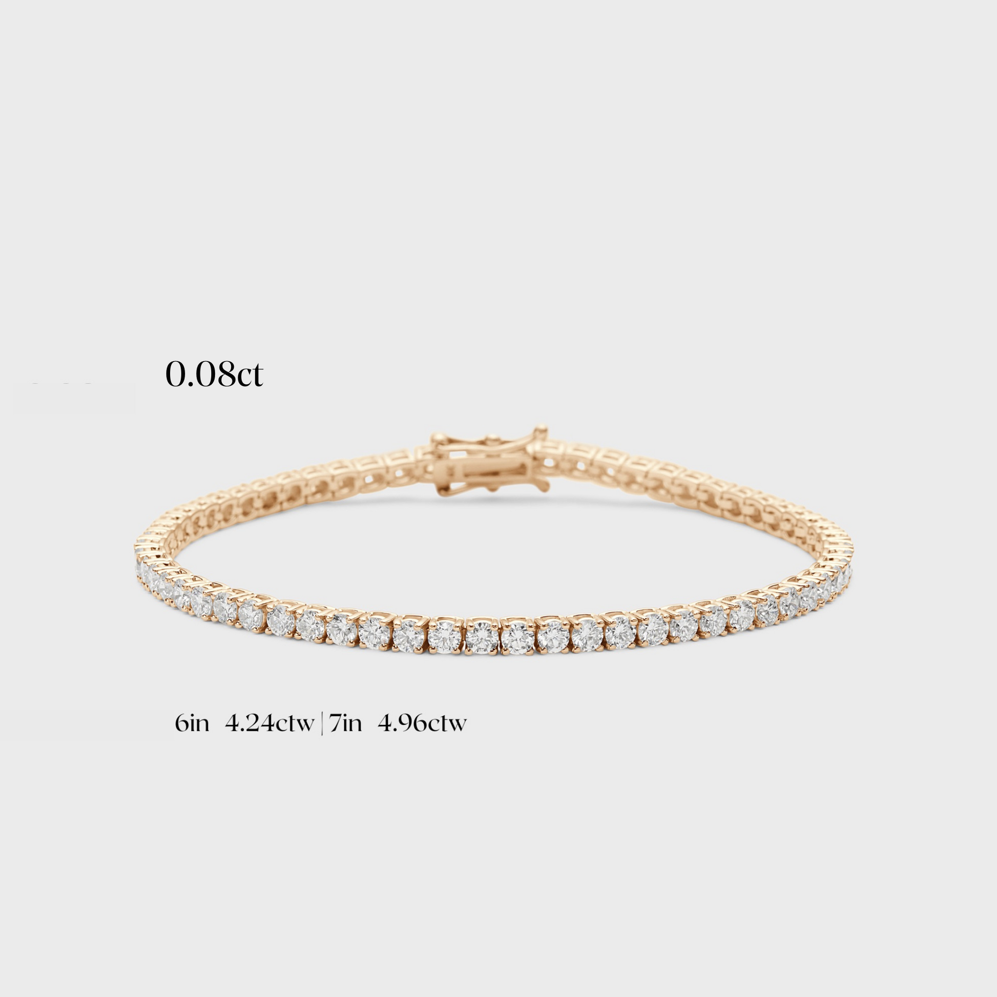 - Total carat weight based on 0.08ct: 6” = 4.24ctw | 6.5” = 4.60ctw | 7” = 4.96ctw | 7.5” = 5.32ctw*