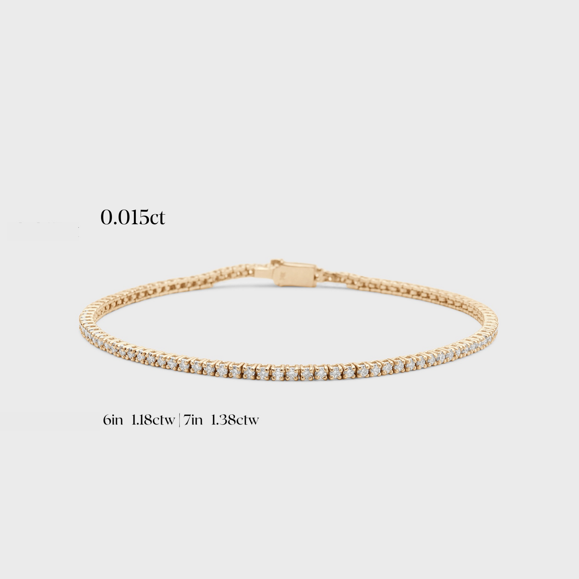 - Total carat weight based on 0.015ct: 6” = 1.18ctw | 6.5” = 1.28ctw |7” = 1.38ctw | 7.5” = 1.48ctw*