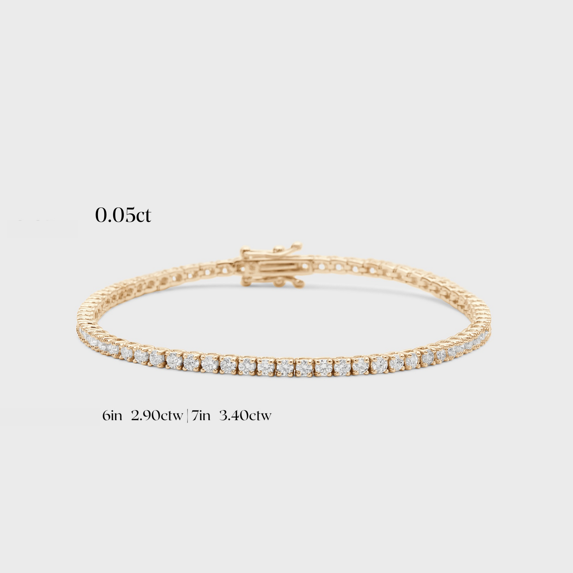 - Total carat weight based on 0.05ct: 6” = 2.90ctw | 6.5” = 3.15ctw |7” = 3.40ctw |7.5” = 3.65ctw*